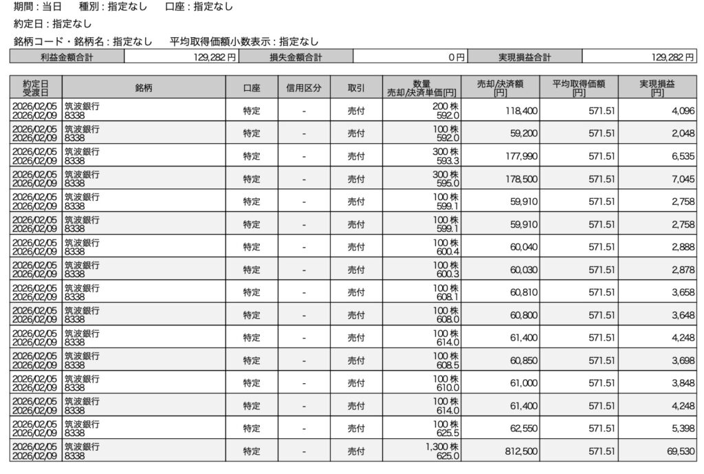 寄り付き成行で『筑波銀行』と他の銀行を仕込んで筑波銀行が15時場中決算だったので決算後の